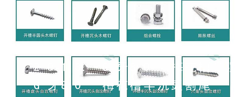 1.機螺釘 2.自攻螺釘 3.鉆尾螺釘 4.墻板釘 5.纖維板釘 6.木螺釘7.六角木螺釘 8.不脫出螺釘 9.組合螺釘 10.微型螺釘 11.家具螺釘 12.電子螺釘頭型:1.六角頭(hexagon head) 2.六角頭法蘭面(hexagon head with flange) 3. (3)十字槽半沉頭自攻螺釘:GB/T6562,ASME B18.6.4,SAE J81。 (4)六角頭自攻螺釘:GB/T6563,ASME B18.6.4,SAEJ81。 (5)內六角花形圓柱頭自攻螺釘:GB/T6564,ASME B18.6.4,SAE J81。 (6)內六角花形盤頭自擠螺釘: ASME B