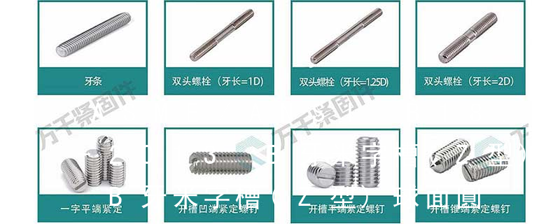 T型槽螺母 T-slot nuts 單頭螺柱 Single end studs 地腳螺栓 Masonry bolts 帶槽圓螺母 Slotted round nuts 端面帶孔圓螺母 Round nuts with drilled holes in one face 開槽平端緊定螺釘 Slotted set screws with flat